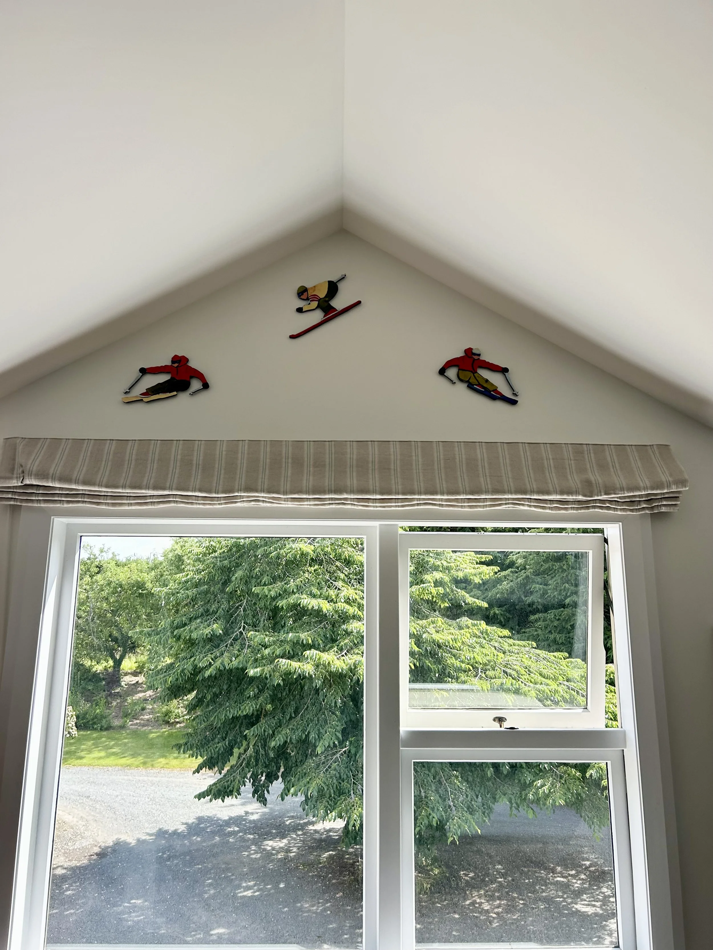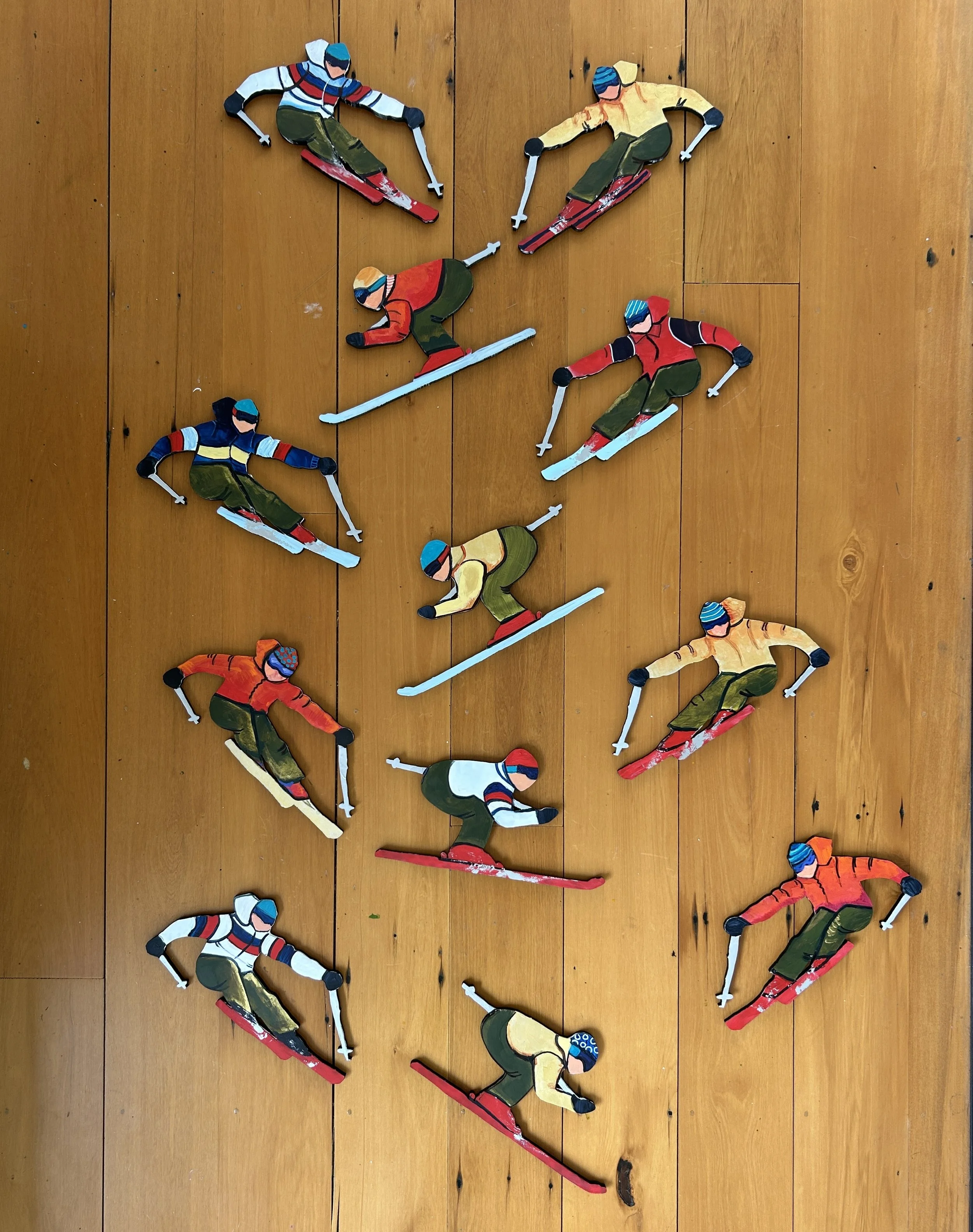 The little laser cut skiers are very popular and are painted to order , you let me know the colours and how many you require. They are 26cm Long, laser cut on MDF and hand painted with acrylic and gold foil .